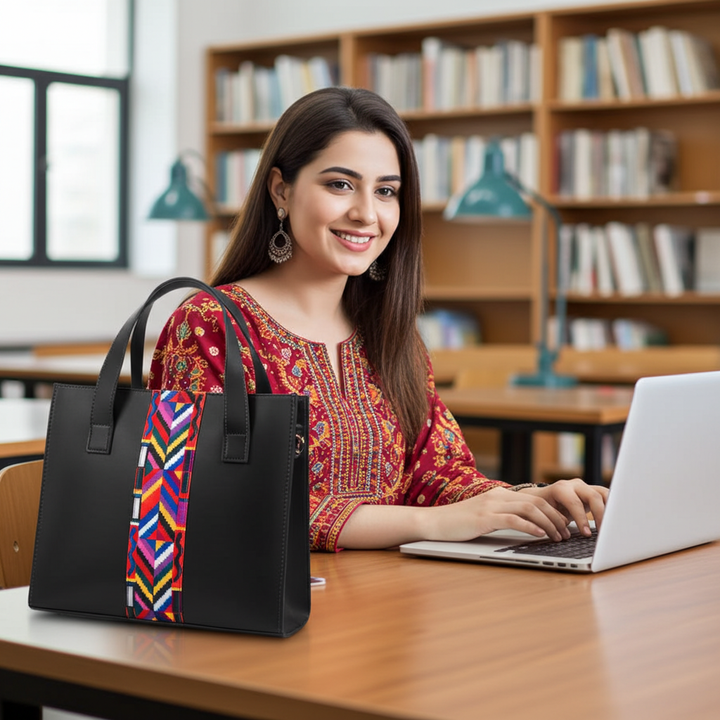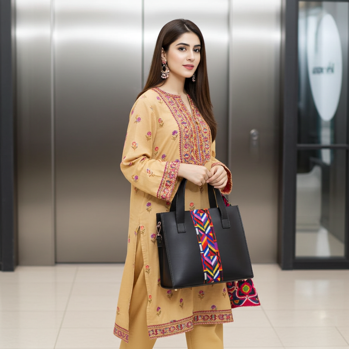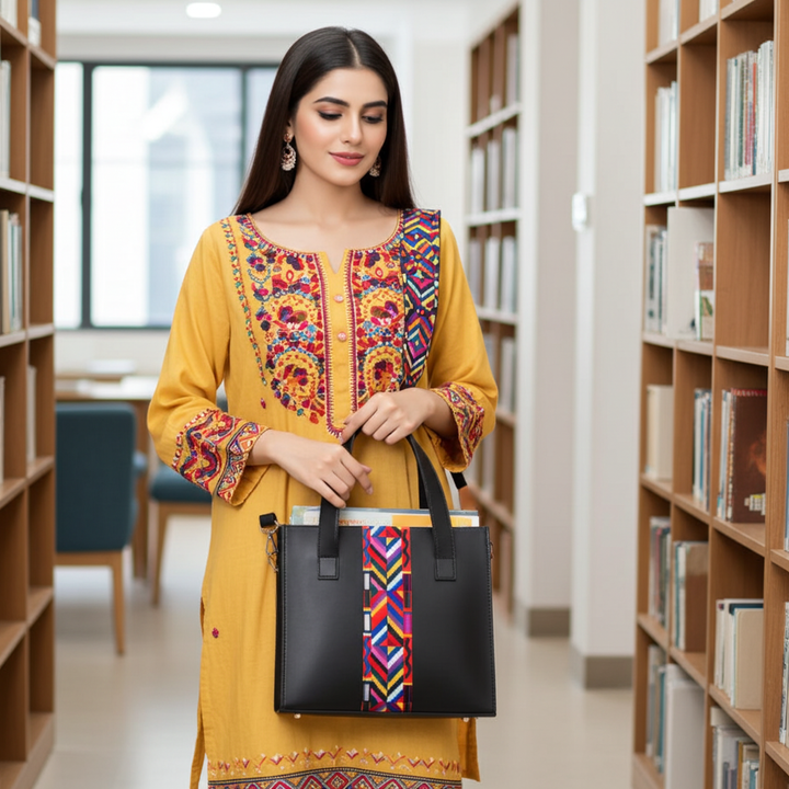 This Stylish Berlin Bag is made from premium vegan leather, making it a lightweight and durable accessory. The spacious main compartment has a top zipper closure to securely store your items with ease. The additional studs at the bottom of the bag provide extra protection against scratches, making it perfect for everyday use and university life. Inside the compartment with zip closure allows you to synchronize your belongings. The front contrast colourful stripe makes this trendy bag more attractive and matches with your gorgeous outfits.