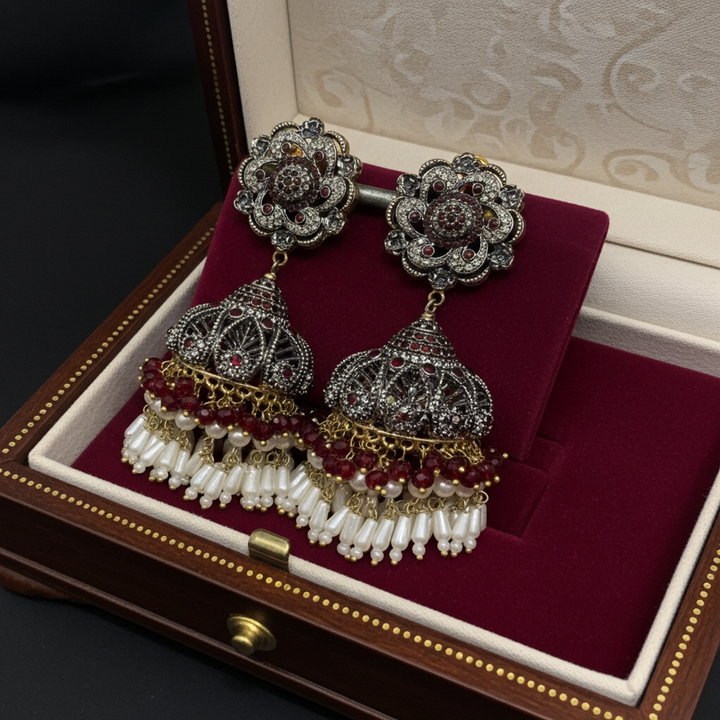Regal Color Palette: The stunning bell-shaped jhumka is richly adorned with deep, maroon-colored stones set against an antique silver-toned finish, creating a captivating vintage look.