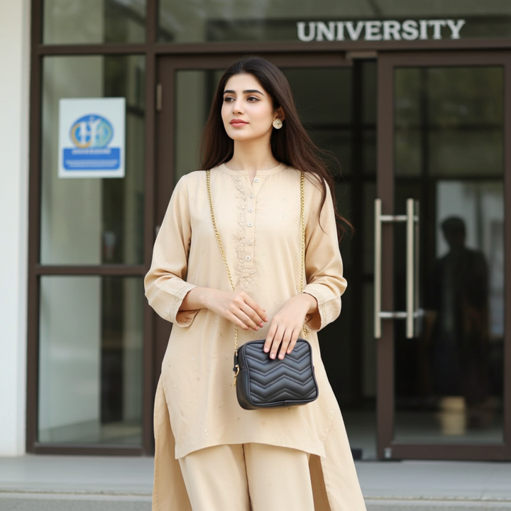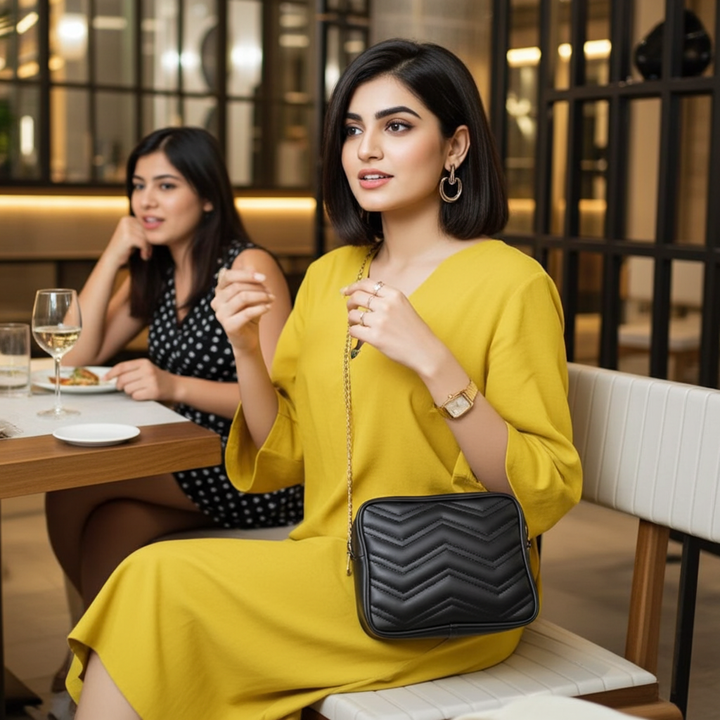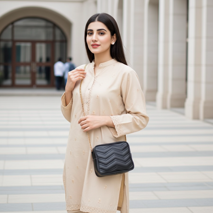 The Omni crossbody bag features a stylish and effortless design, complemented by a gold aluminum chain that adds a touch of elegance. This small bag is perfect for both eastern and western styles, and the detachable chain allows for versatile wear. Elevate your outfit with this fashionable and functional accessory.
