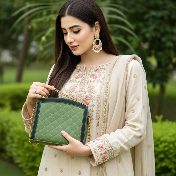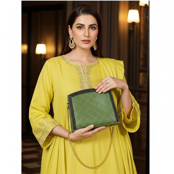 Expertly crafted from soft suede leather, this crossbody bag will elevate any outfit with its stylish design. The cross stitch detailing on the front adds a touch of elegance, while the golden aluminium chain and soft leather handle provide both style and comfort. With a spacious center pocket, it's perfect for both western and eastern outfits.
